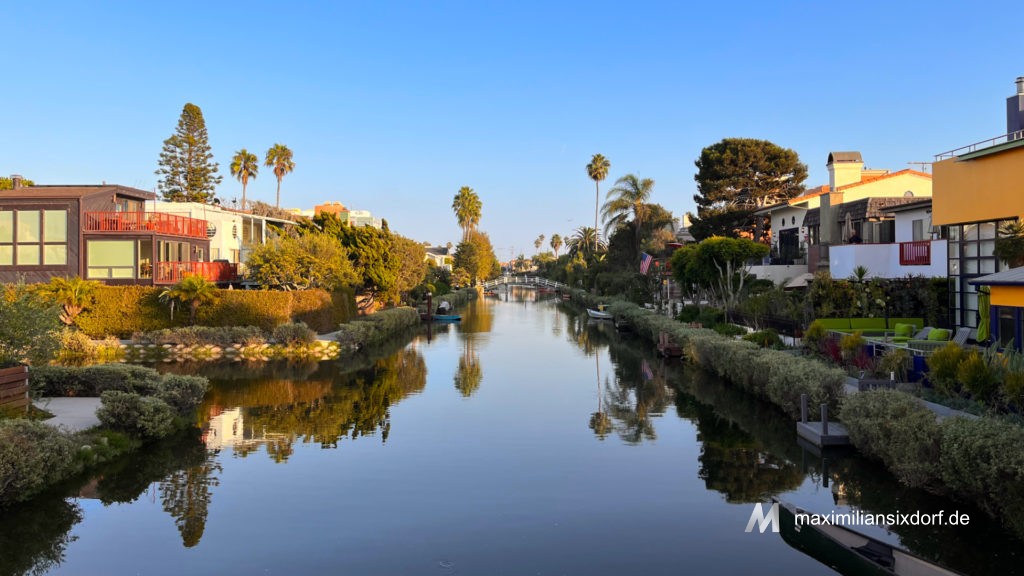 Schön war es ja anzusehen, wenn dort die Sonne über dem Wasser schon relativ tief steht. Unser Ziel war nämlich an einem Nachmittag den Sonnenuntergang am Venice Beach zu genießen. Doch zuvor haben wir uns über die engen Fußwege und Brücken der Venice Canals bewegt und uns die hübschen Häuser angeschaut. Schick sieht das ganze ja aus und auch botanisch gibt es hier viele tolle Ecken. Doch warum reiche Menschen sich hier ein Haus kaufen, verstehe ich nun wirklich nicht. Es ist alles ziemlich eng, es laufen super viele Touristen an den Häusern vorbei und ehrlicherweise stinken die Kanäle auch ein wenig.